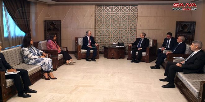 Damascus, SANA- Foreign and Expatriates Minister Dr. Fayssal Mikdad discussed Sunday with UN special Envoy for Syria, Geir Pedersen and the accompanying delegation the latest developments related to the envoy’s mission.