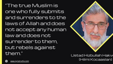 “The true Muslim is one who fully submits and surrenders to the laws of Allah and does not accept any human law and does not surrender to them, but rebels against them.”